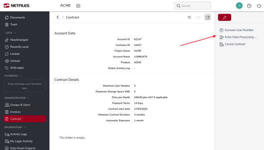 The responsible administrator and other authorised administrators can access contract information under “Administration > Contract“. The following self service functions are available: