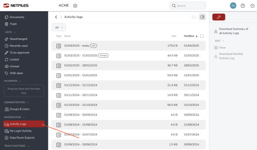 Administrators of a netfiles data room have under “Information” > “Activity logs” in the left-hand navigation bar to access the activity log. There you can see all the logged actions of your entire data room.