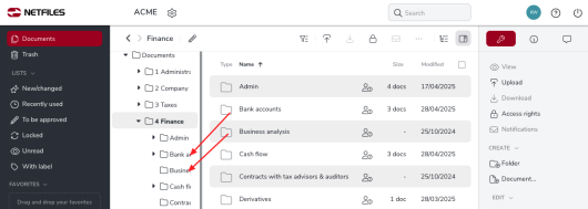 Please note that from now on, folders and documents that you create directly under the higher-level folders will receive the rights of the higher-level folder. For this reason, it is easier to create the folder structure in advance.