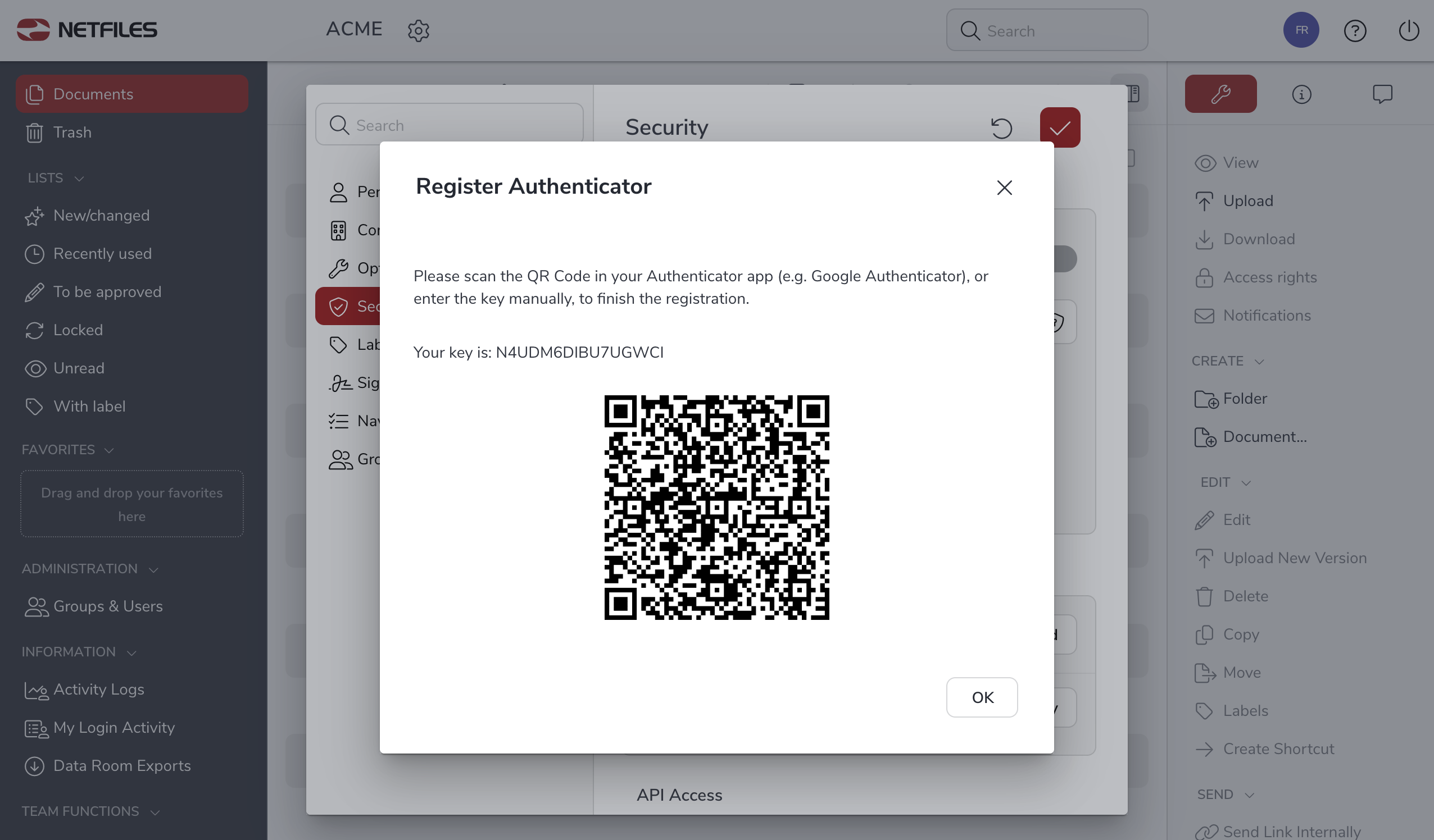 When using another authenticator app, such as Google Authenticator, the security code from the following dialog must be entered into the app or transmitted via QR code.