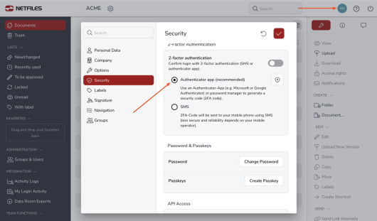 Click on “Your name” at the top right of the data room and then select “Security”. Here you can choose between Authenticator app and SMS under “2-factor authentication”. SMS is preselected, click on Authenticator app.
