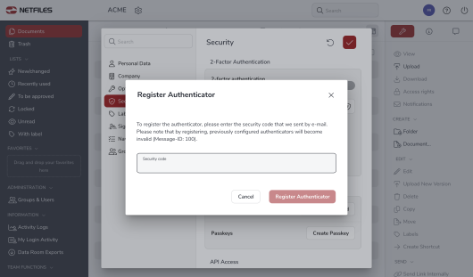 The next time you log in to your netfiles data room, you must enter the one-time password from the Authenticator app after entering the access data.