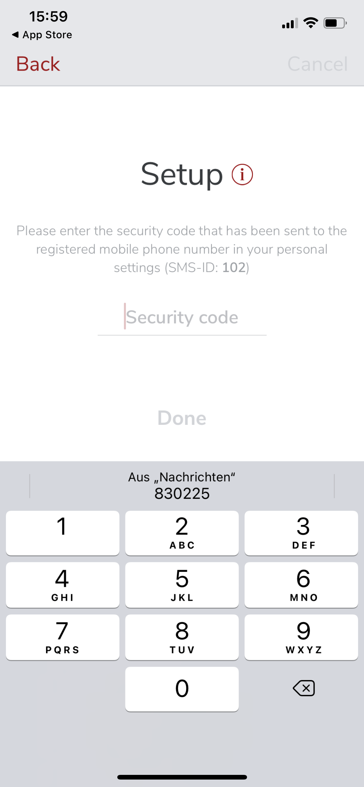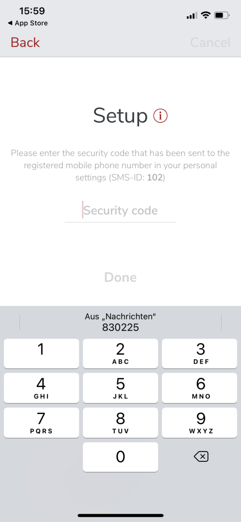 To set up the Authenticator app, a security code is sent to the user’s cell phone by SMS after the user and password have been entered when using the netfiles app. This security code must be entered once after entering the netfiles user name and password in the netfiles Authenticator app when setting up the app.