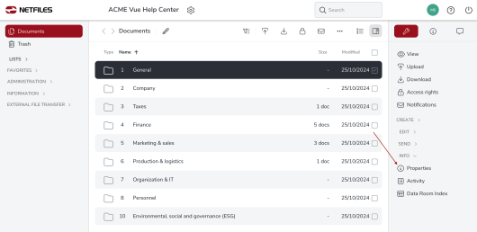 Administrators can activate automatic notifications (notifications of changes) for all folders in the data room. Select a folder and open “Properties” in the right-hand function bar.