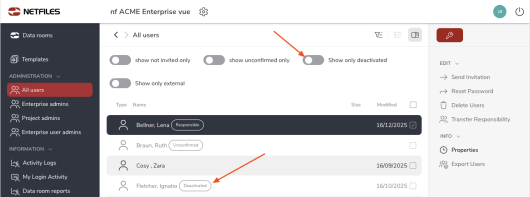 Deactivated users are marked with a “Deactivated” label. In the “All users” area, you can use the “Show only deactivated” filter to display only deactivated users.