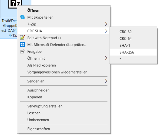 A commonly used ZIP tool is the software 7-zip. In the context menu (tight-click onto the file name), call the function CRC SHA and select SHA-256: