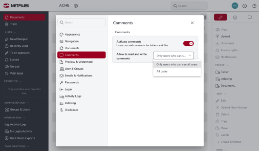 With the Comments feature, users of your data room can write and read comments on folders and files.