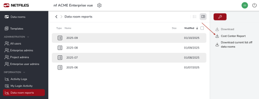 To generate a cost center report, click on “Data room reports” under “Information” on the left and then on “Cost center report” on the right.