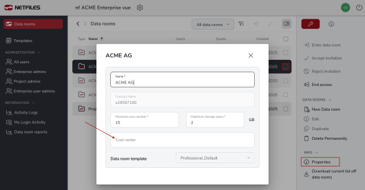 To add a cost center to the data room properties, select the desired data room and click on “Properties” in the right-hand function bar. In the following dialog, you will find the “Cost centre” field further down.