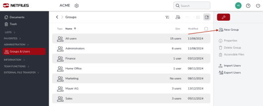You can only assign access rights in the data room for groups. It is therefore best to create groups based on the authorizations that the members of the group should receive. For example, you can create separate groups for internal departments, board members, external partners, consultants or bidders. You have two options for creating new groups. First, select the “Manage > groups and users” area in the left-hand function bar. 1. new group: creates a new, empty group.