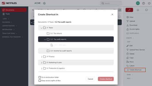 With “Create Shortcut”, you can create a link (alias/link) to the selected documents and save it in another folder within your data or project space. Links themselves do not take up any storage space. Please select the file from which you would like to create a link. Then click on “Create Shortcut” and select the folder in which you want to save the link in the following dialog.