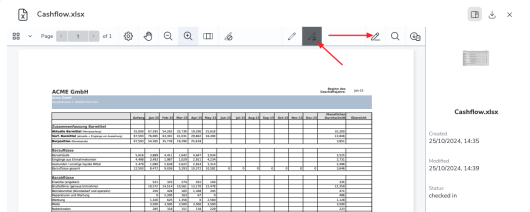 If you want to download the file with the annotations, click on the lower download arrow in the upper right corner. If you use the download arrow next to the close X, the file will be downloaded without the annotations. Please note that a download is only possible if you have been given the relevant access right by the administrator of the data room.