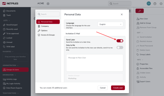You can optionally create users in netfiles first and invite them at a later time, e.g. when the data room has been completely set up and all documents have been uploaded. To do this, activate the “Send invitation at later time” option when creating a user.