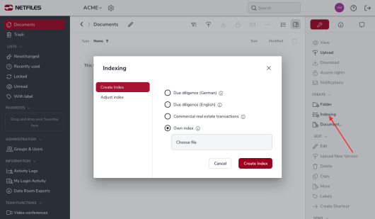 You can also set up a sample due diligence index or a standard index for commercial real estate transactions by the Gesellschaft für Immobilienwirtschaftliche Forschung e.V. (Society for Real Estate Research). To use either index, select the respective option in the Indexing dialoge and klick Create Index. netfiles then automatically creates the selected structure. Please note that folder names for both structures are only available in German.