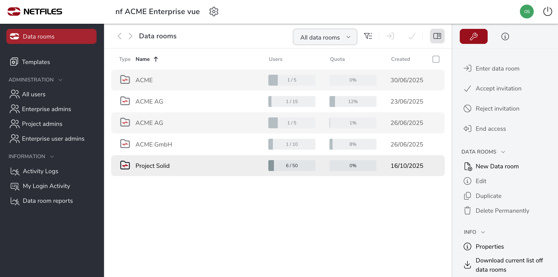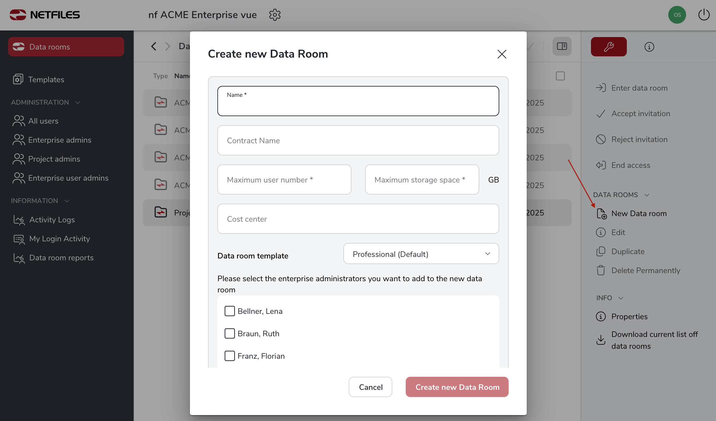 Data room administration (netfiles Enterprise, Data Room Premium)
