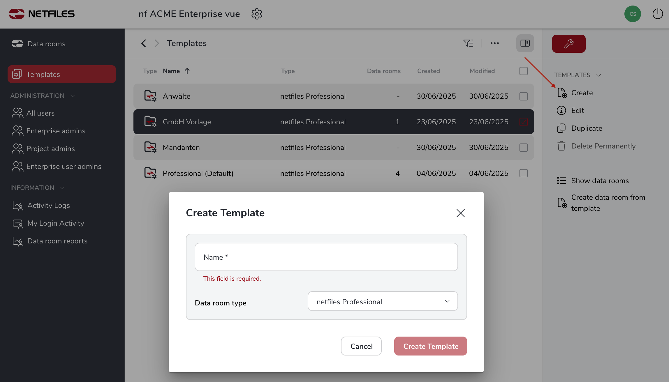 Templates for creating data rooms can be created here. A standard template for creating data rooms is already stored.