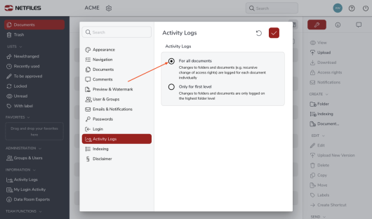 Go to the data room settings by clicking on the gear wheel next to your data room name. Here you can check the box “For all documents” under “Activity Logs” to enable changes to folders that affect all subfolders and the documents they contain (e.g. recursive changes of access rights) to be logged for each document individually.