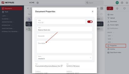 netfiles offers you the option of creating short descriptions of individual documents. This allows you to quickly and easily provide project participants in your data room with brief information about uploaded documents. Descriptions can be entered or changed via the “Properties” in the right-hand function bar.