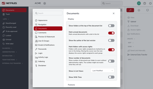 - Approval function: If this function is enabled, administrators can optionally mandate for new documents to require approval by a second user prior to being displayed (Four-Eyes Principle) (This feature is only available in netfiles Data Room Premium and netfiles Data Vault.)