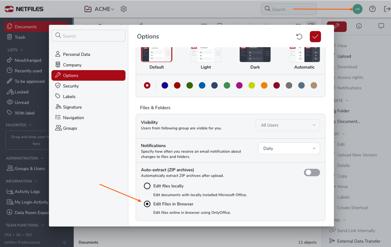 You can activate the browser-based editing of Office documents with OnlyOffice in your user settings (by clicking on your “username” in the top right corner), via the “Options” section. Select the option “Edit Files in Browser” here.