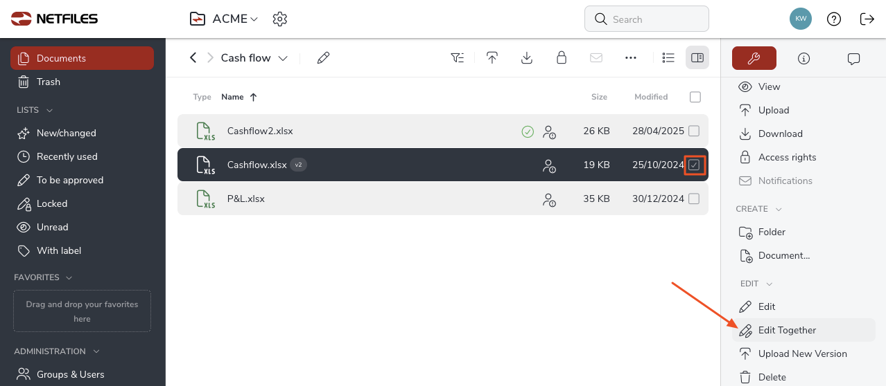 Other users will see the label “Working copy” next to the document name and two pens as an icon, which means “editing together.” By checking the document and clicking on “Edit together” on the right, users can now edit the document together and simultaneously.