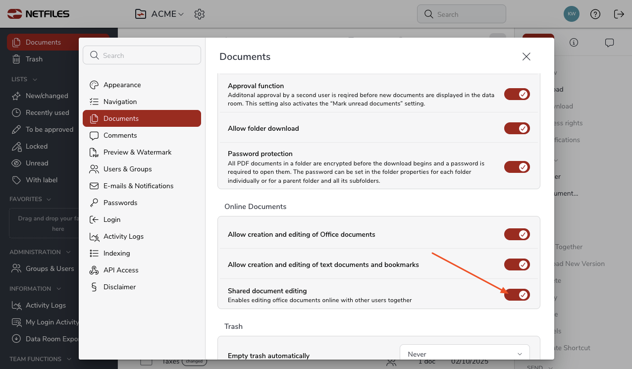 Go to “Documents” in the data room settings (as administrator). Here you will find the “Shared document editing” feature under “Online documents.” Check this box.