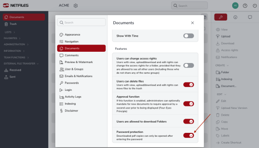 Folders for which the PDF download password option has been activated are marked with an icon in the document list.