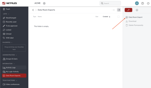 In the “Information” area, administrators can create an archive of the data room by clicking “Data room exports”.