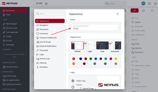 As an administrator, you can change the data room/project name of your data room by clicking on the gear icon next to your data room name. The first item under “Appearance” is the data room/project name. Overwrite the name listed in the box and click on the tick at the top right of the dialog box to save.