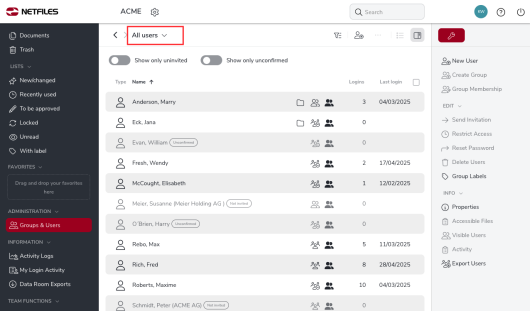 An administrator in a netfiles data room can control which other users can see a user in the data room by going to “All users” in the “Groups & Users” area.