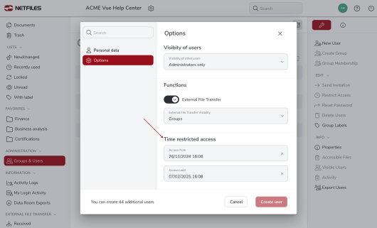 Administrators can set a time period for users during which they have access to the data room. For example, you can simply terminate access to the data room for external parties when the data room is closed. You can restrict access for users directly when creating users, but also for existing users.