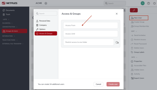 In the “Groups & users” area, click on “New user” on the right. > “Access & Groups” and enter a date and time in the “Access from” and “Access to” input fields in the following dialog.