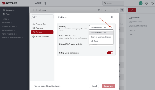 When creating users, administrators and group administrators can specify whether and which other users a user can see. When you create new users, you have three settings available for this: