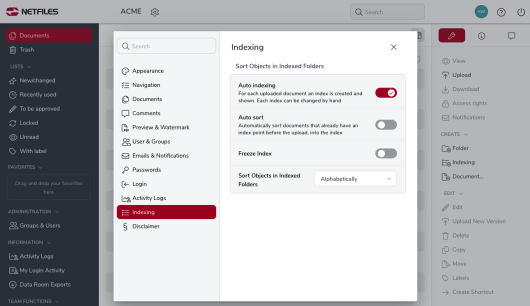 If the “Freeze index” option is activated in “Administration > Settings > Indexing”, the contents of the data room that are indexed can no longer be changed. Folders and files that were created without automatic indexing can still be changed.