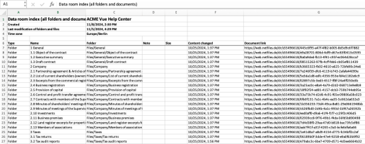 This article is aimed at users; administrators can call up a data room index of all documents on the left under Information “Data room index”. If you need a list of all folders and documents (index) of all your available documents, you can download this as an Excel document.