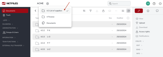 Click on the small arrow next to the folder name to open the navigation path with which you can quickly navigate within your data room.
