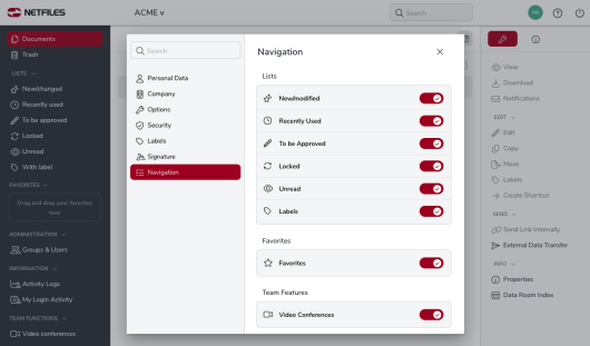 In the netfiles data room, you have the option of switching certain features in the data room on or off in your personal settings. To do this, click on your user name in the top right-hand corner of the data room and select “Navigation”. In the following dialog, you can activate or deactivate features for yourself.