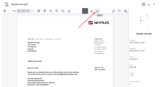 Open the desired PDF document in the netfiles document preview under “All documents” and click on “redact” at the top.