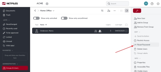 As an administrator, you can reset the password for individual users of your netfiles data room so that they can set a new password. Select “Groups & Users” in the left-hand navigation bar in the administration area > and then go to “All users”. Select the relevant user and click on “Reset password” in the right-hand function bar.