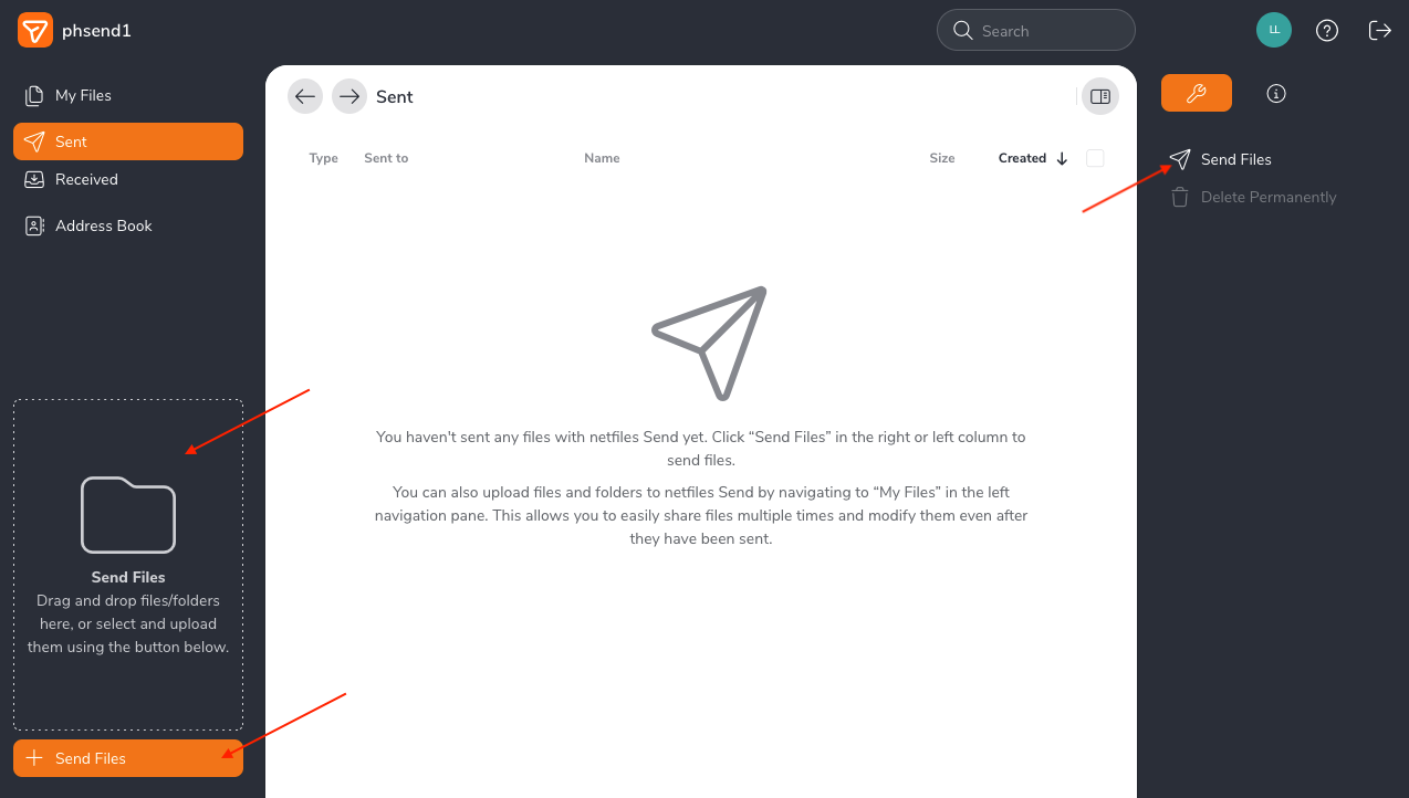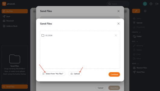 Select the file directly from your file system by clicking on “Send files” on the left or right. Alternatively, you can drag and drop the file or folder into the left-hand sending area.