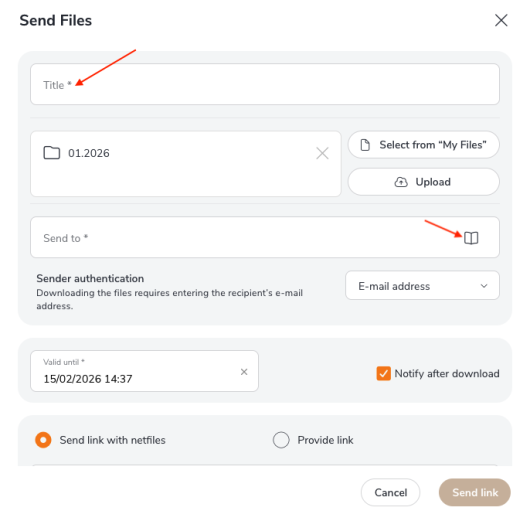 In the next dialog, enter a “Title” and the desired e-mail address(es) to which you want to send. You can also select existing contacts from your “Address book” by clicking on the book in the e-mail line. Under “Valid until” you can specify the validity of the link or download.