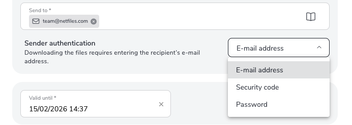 In the “Sender verification” area, you can choose whether the recipient must enter their email address to download, confirm their email address with an automatically generated security code or enter a password. You define the password in this dialog and must send it to the recipient in a different, secure way.