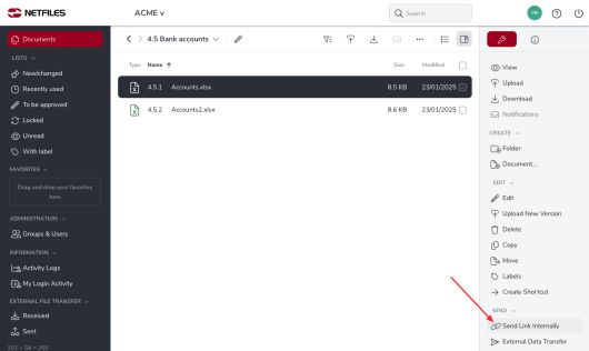 You can use “Send link internally” to send links to folders and files to other users in the netfiles data room. To do this, select the relevant files and folders and choose the “Send link internally” function from the function bar on the right.