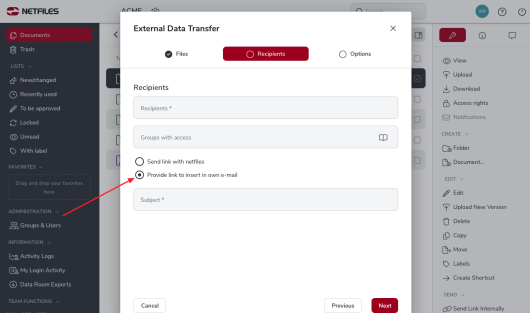 Enter the “Recipient” addresses and a “Subject” in the dialog so that the download link can be individualized and you later have an overview of all sending actions in the “Sent” folder of netfiles. Use the “Options” to protect the download link with a password, to receive a copy or to receive a confirmation of receipt after the download by the recipient. After clicking on “Create link”, the download links are available to you. You can now copy the link and paste it from the clipboard into an e-mail.