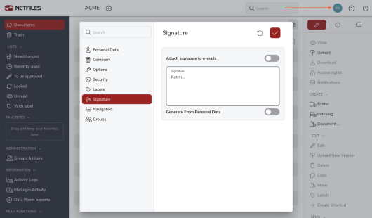 You can add an individual signature to messages that you send from netfiles. To set up the signature, click on your user name at the top right and then on the “Signature” menu item.