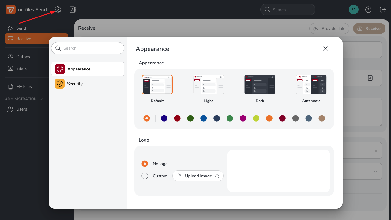 As an administrator, you can set general default settings for netfiles Send. To do so, click the wheel icon.
