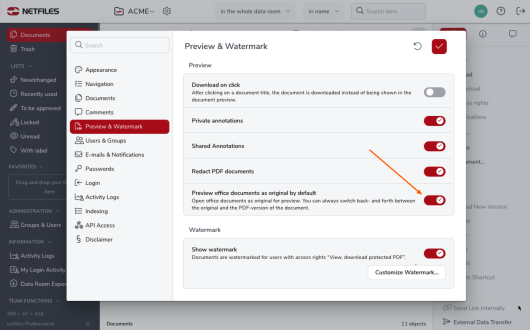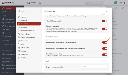 To activate this feature, go to the data room settings (gear icon next to the data room name), navigate to “Documents” in the left-hand bar and enable the option “Allow creation and editing of Office documents”.