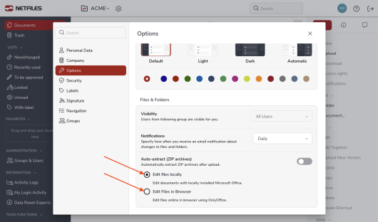 If the edit feature is enabled, users can choose whether they want to use their locally installed Microsoft Office or online OnlyOffice to edit documents in the data room.