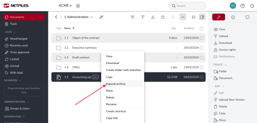 You can also unpack ZIP archives that were not unpacked during the upload afterwards on netfiles. Click with the mouse on the file on the right and then go to “Expand archive”.