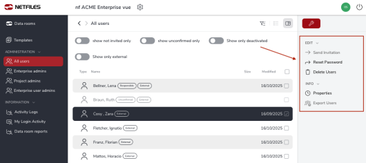 In the “Administration” area, Enterprise Administrators can view and manage the user accounts of the entire Enterprise environment. This also applies to the user accounts of the data rooms to which an Enterprise administrator does not have access.